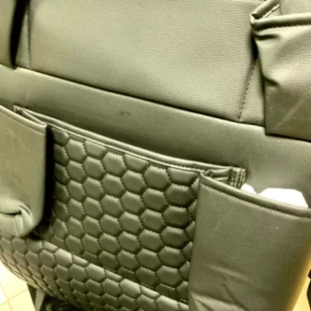 Crafted from eco-leather, this seat back organizer is waterproof and easy to clean with a damp cloth. The clear TPU pocket is also waterproof and safe for babies. All materials used are vegan and non-toxic.