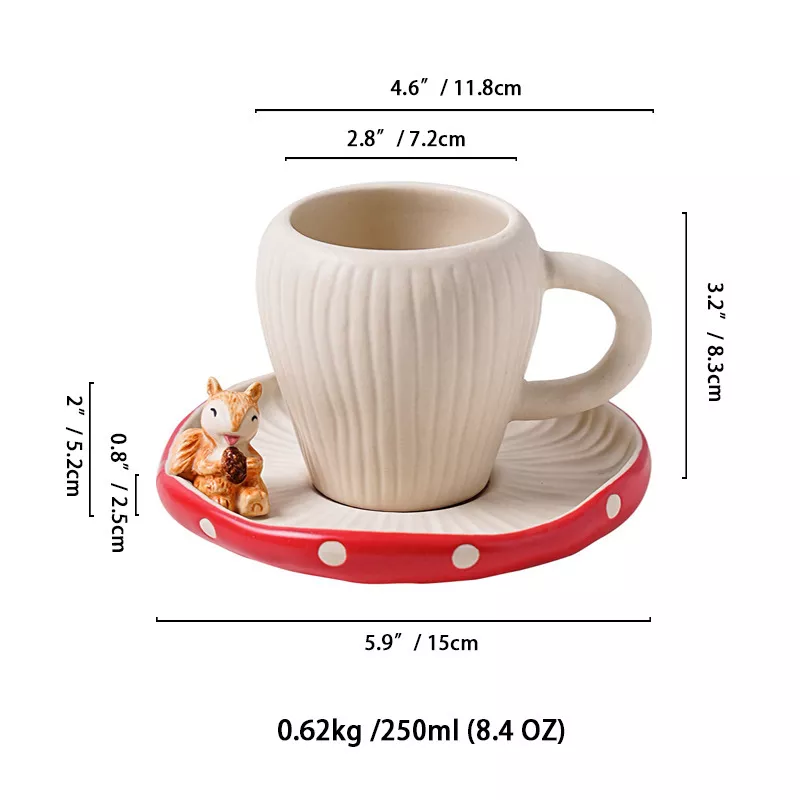 Transform your tea or coffee breaks into a whimsical escape with this adorable ceramic mug featuring a playful squirrel and chestnut design, accompanied by a matching saucer. Perfect for sipping your favorite hot beverage, whether it’s a morning coffee, afternoon tea, or a cozy hot chocolate, this mug adds a touch of nature and charm to any setting. Its exquisite mushroom detailing and delicate Camellia flower accents bring the beauty of the outdoors right to your table, elevating your drinkware collection.